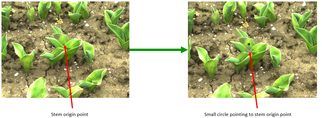In het linker figuur hier onder zie je twee annotaties waarbij bijna de gehele plant met de cirkel beschreven wordt, en waarbij het centrum van de cirkels op de grond gericht staat. Maak de cirkels in dit geval wat kleiner en richt het centrum op de stam van de plant waar deze de grond uit komt (zoals in het rechter plaatje)