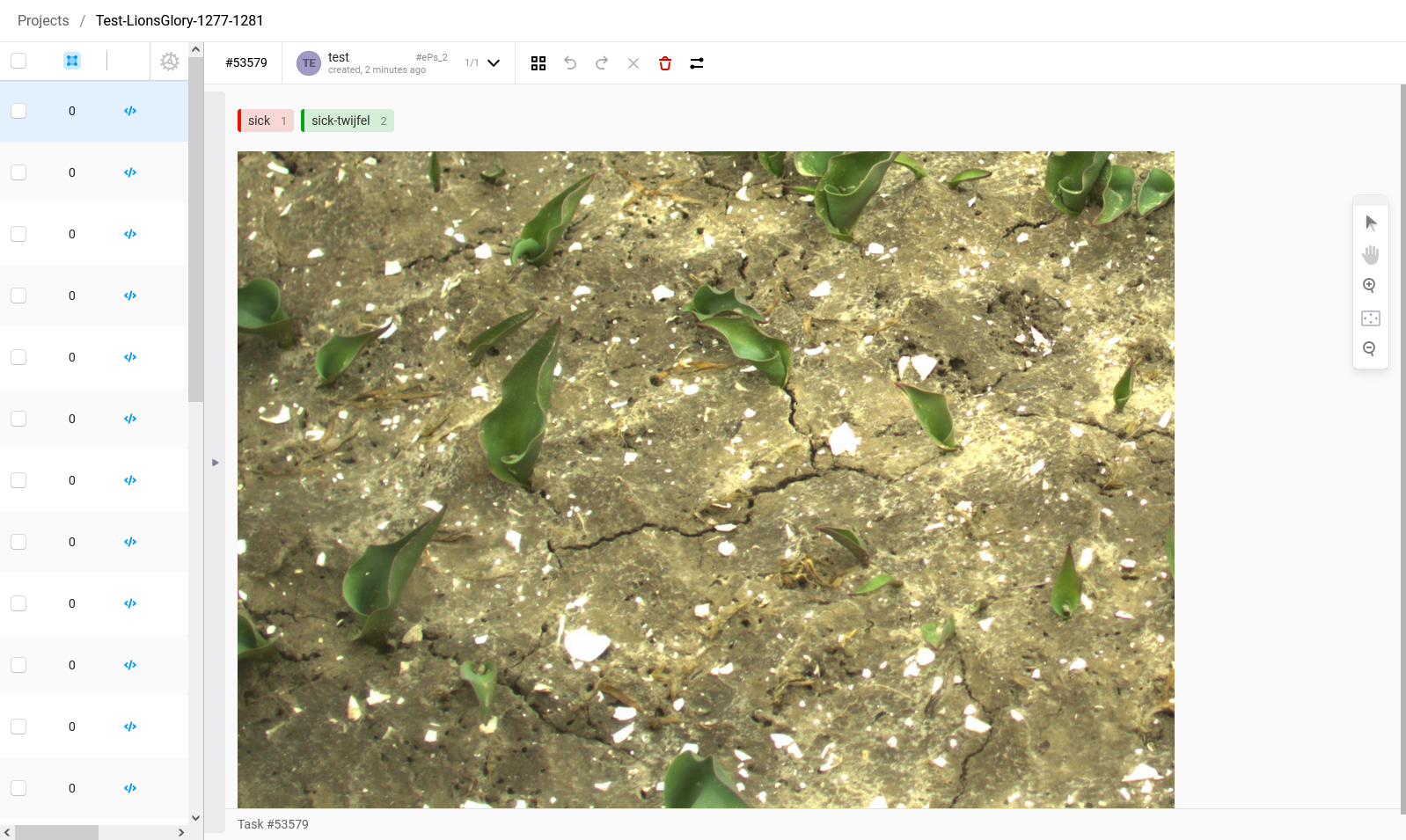 5. To create an annotation of a virus-infected plant, press '1' on the keyboard. You will see that the label will become red. If you are doubting whether the plant is infected and you would have liked to have a view from another angle before deciding, you can select the label 'sick-twijfel' by pressing '2'. If you see a plant that is obviously sick, a textbook example of a sick tulip, a plant that you are 100% sure that is sick then select the label 'super-sick' by pressing '3'.