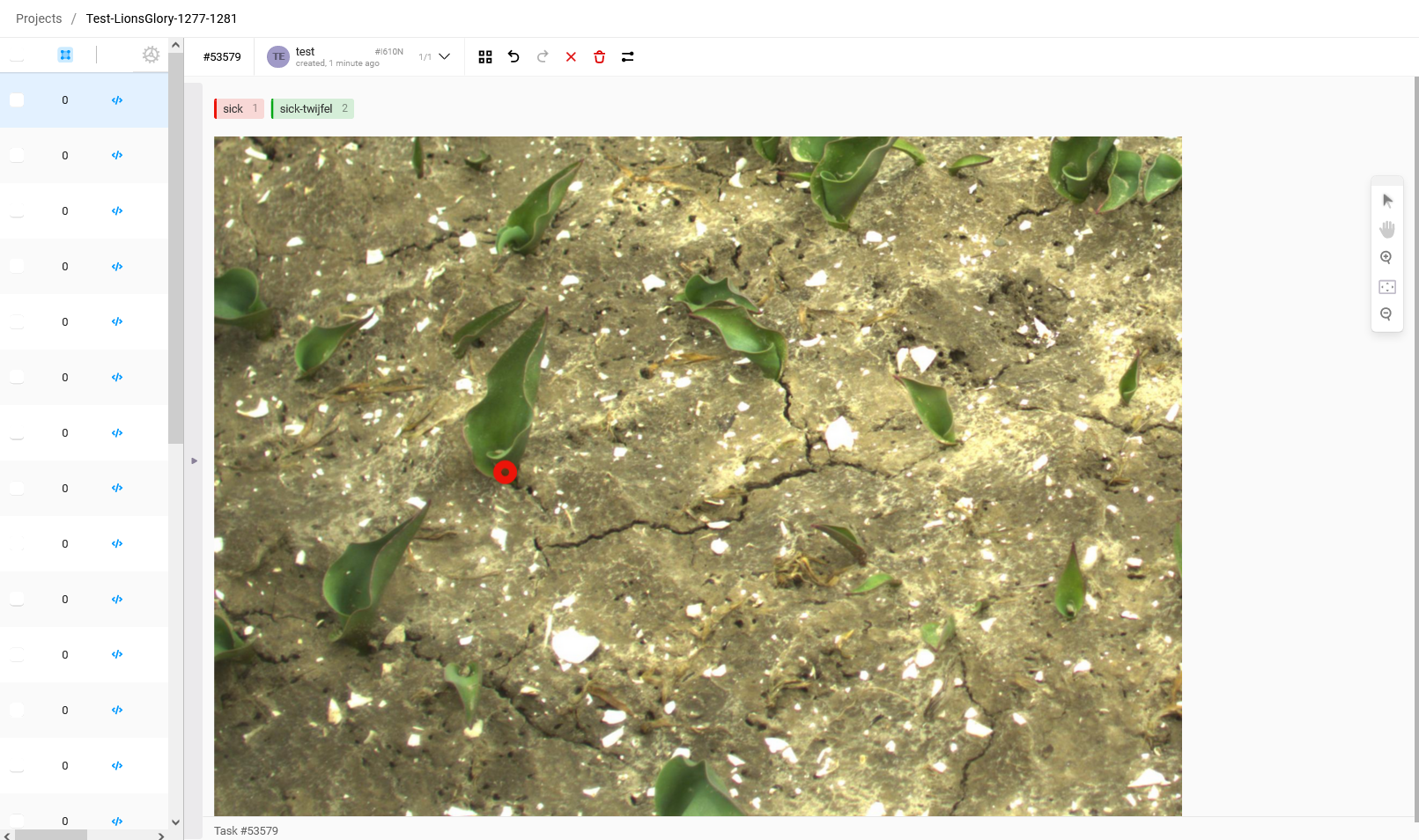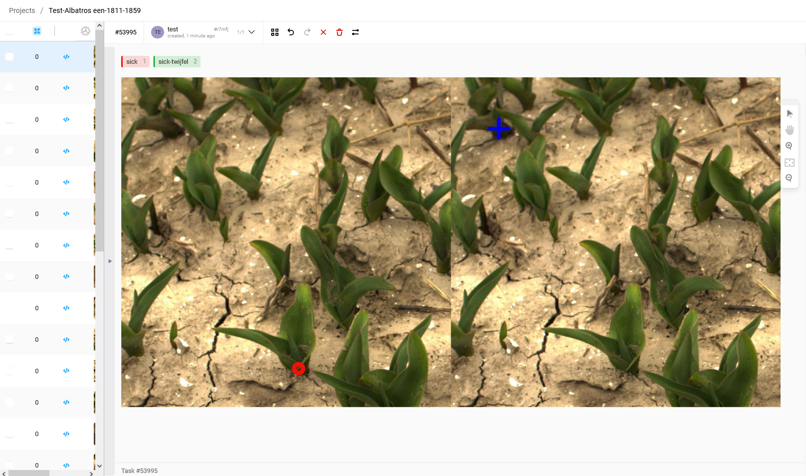 5. To create an annotation of a virus-infected plant, press '1' on the keyboard. You will see that the label will become red. If you are doubting whether the plant is infected and you would have liked to have a view from another angle before deciding, you can select the label 'sick-twijfel' by pressing '2'. If you see a plant that is obviously sick, a textbook example of a sick tulip, a plant that you are 100% sure that is sick then select the label 'super-sick' by pressing '3'.