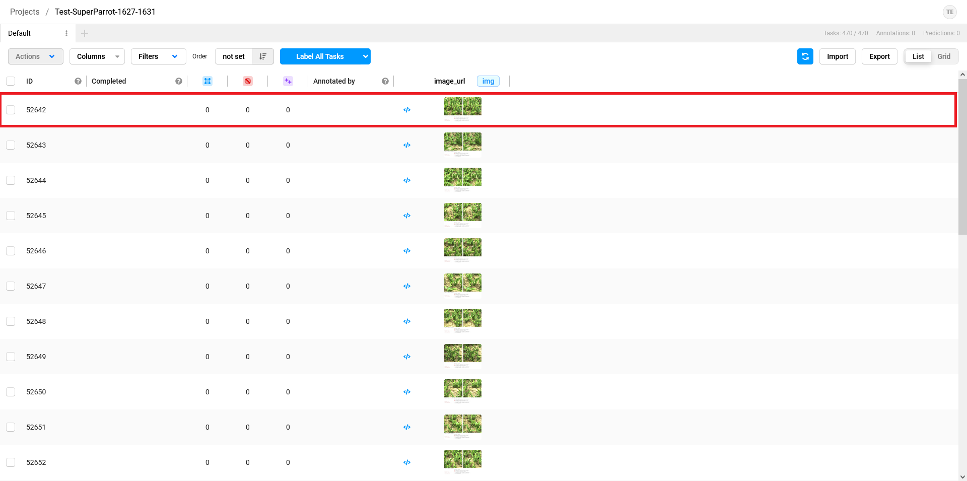9. In the column lined in green, you can see a circle with the initial letters of your first name and last name if an annotation is saved for that image. The image you are currently working is highlighted in blue, as can be seen in the red lined row.