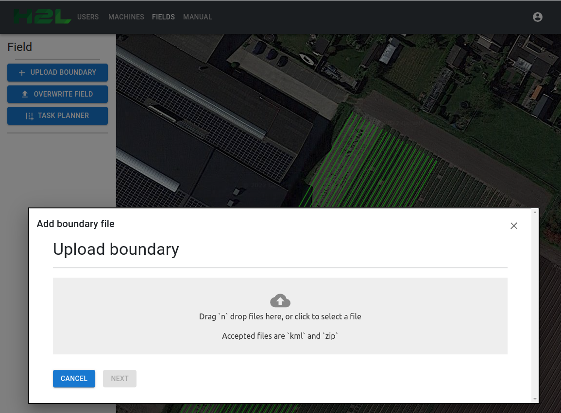 Om een nieuw veld te kunnen uploaden, ga naar h2lselector.com/fields/add en kies een csv, kml of zip bestand van uw computer.