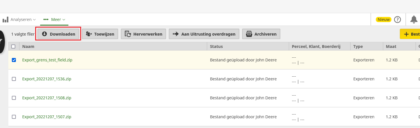 Hieronder wordt aan de hand van enkele screenshots stap voor stap beschreven hoe u de grens een perceel kunt exporteren als .zip vanuit de MyJohnDeere omgeving.