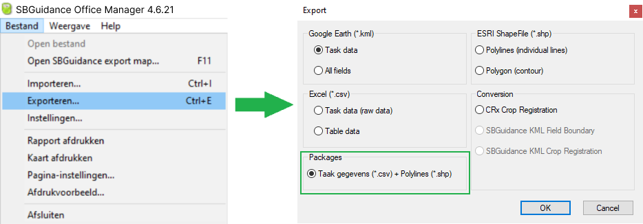 Selecteer de naam van het veld die u graag wilt exporteren. Van de lijst aan taken, selecteer ook de planting task. Zoals hieronder is weergeven. Als u de categorie packages niet ziet, update dan uw Office Manager versie.